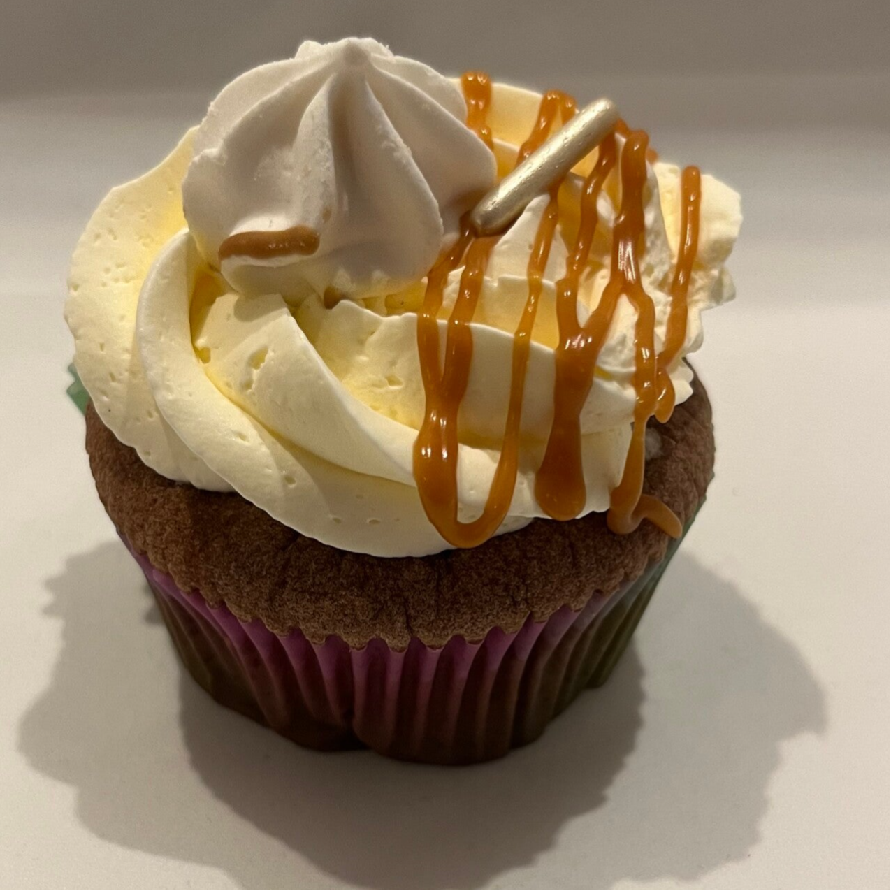 Een speculaascakeje gevuld met salted caramel en bovenop een toefje boterroom met speculaas.